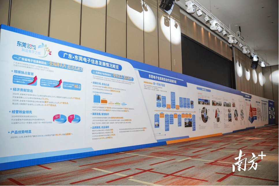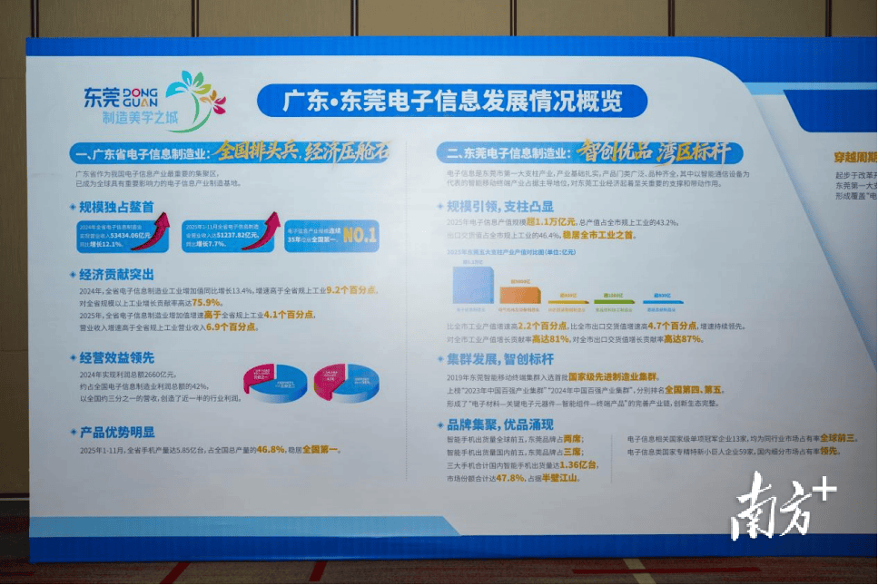 从展示墙了解到,广东电子信息产业2024年实现利润总额2660亿元,约占全国的42%,相当于以全国约三分之一的营收,创造了近一半的行业利润。进入2025年,产业优势继续巩固——2025年1至11月全省手机产量达5.85亿台,占全国总产量的46.8%,龙头地位持续稳固。