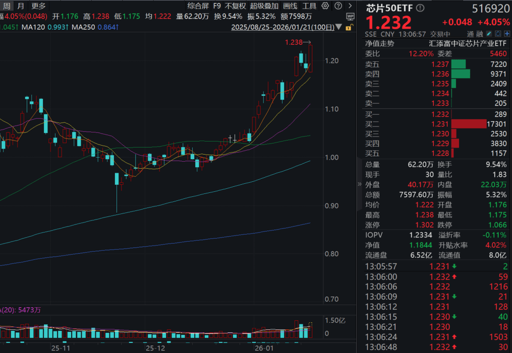 今日(1.21),芯片板块高歌猛进,全市场费率最低档的芯片50ETF(516920)放量大涨超4%,盘中成交额8000万元!资金面上,芯片50ETF(516920)已连续2天获资金青睐,累计“吸金”超3800万元!