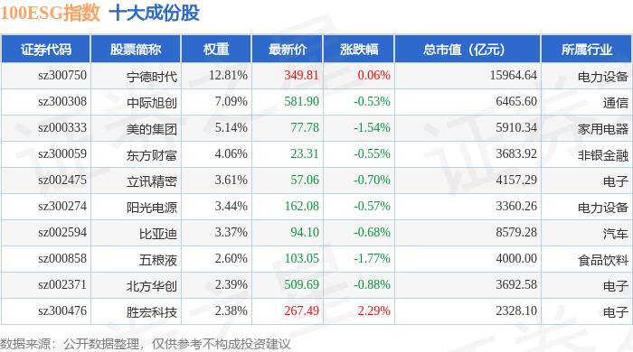 100ESG(970027)指数十大成份股详情如下: