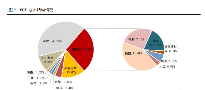 铜箔、树脂、玻纤布是 PCB 核心原材料,随着 PCB 技术迭代升级,向低 Dk\Df 方向逐步发展。覆铜板是制作 PCB 的核心中间产品,是由木浆纸或玻纤布等作增强材料浸以树脂胶液,覆以铜箔,经热压而成的板状材料,担负着印制电路板导电、绝缘、支撑三大功能,对电路中信号的传输速度、能量损失和特性阻抗等有很大的影响。覆铜板在 PCB 中成本占比最高,达到 27.3%。铜箔、树脂、玻纤布是覆铜板三大核心原材料,分别占覆铜板成本的 42.10%、26.10%、19.10%,直接影响了覆铜板的品质,进而对 PCB 性能有着巨大的影响。随着 PCB技术迭代升级,对覆铜板低 Dk\Df 要求持续提高,铜箔、树脂、玻纤布等材料同样需向低 Dk\Df方向发展,PPO 树脂、碳氢树脂、Low-DK 电子布、HVLP 铜箔等材料的需求有望实现高速增长,为行业发展提供新增量。