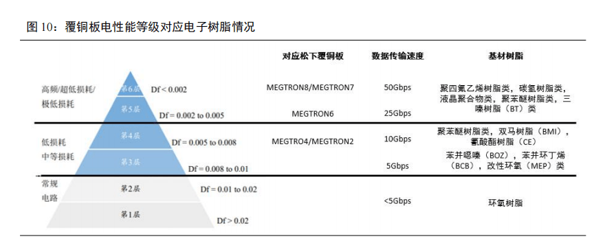 PPO、碳氢树脂综合性能优异,有望成为未来主流高频高速树脂。电子树脂是指能满足电子行业对纯度、性能及稳定性要求的合成树脂。常规覆铜板使用的树脂多为环氧树脂等,但由于环氧树脂自身的分子构型及固化后含较多极性基团,易对覆铜板的介电性能和信号损耗产生不利影响。因此随着覆铜板逐渐向高频高速发展,基于环氧树脂的覆铜板材料开始难以满足产品需求,官能化聚苯醚树脂(PPO)、碳氢树脂等凭借优异的 Dk/Df 性能脱颖而出。目前覆铜板行业中分级标杆产品 MEGTRON 系列最新产品已至 M8 及 M8S,传输损耗性能相比于M7 明显提高,更适用于作为高性能芯片的覆铜板硬件材料。而 M8 系列的覆铜板 Df 需小于0.002,主流基体树脂已向 PPO、碳氢树脂逐渐转变。预计随着高频高速覆铜板的快速发展,未来 PPO、碳氢树等主流高频高速电子树脂的渗透率及市场规模有望逐步提高。
