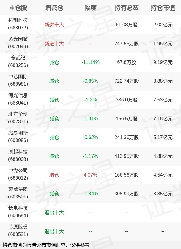 证券之星消息,1月22日国泰基金旗下艾小军管理的国泰CES半导体芯片行业交易型开放式指数基金公布年报,近1年净值增长率70.07%。与上一季度相比,该基金前十大重仓股新增拓荆科技,紫光国微;其中寒武纪持仓占比9.39%,为该基金第一大重仓股;长电科技,芯原股份等退出前十大重仓股;详细数据如下: