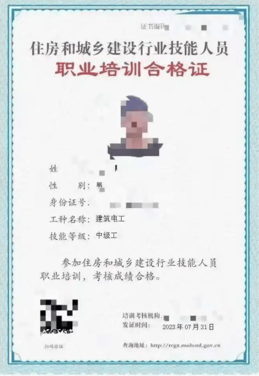 第四种:技能人员建筑电工(建委颁发)也是我们通常所说的建委技工,建委技工是一个基础的上岗证,也是企业办理资质必备证书之一,通常用在资质上面比较广泛,证书样本见下图: