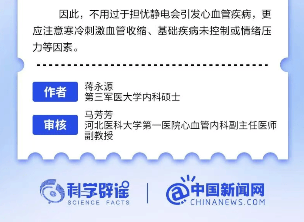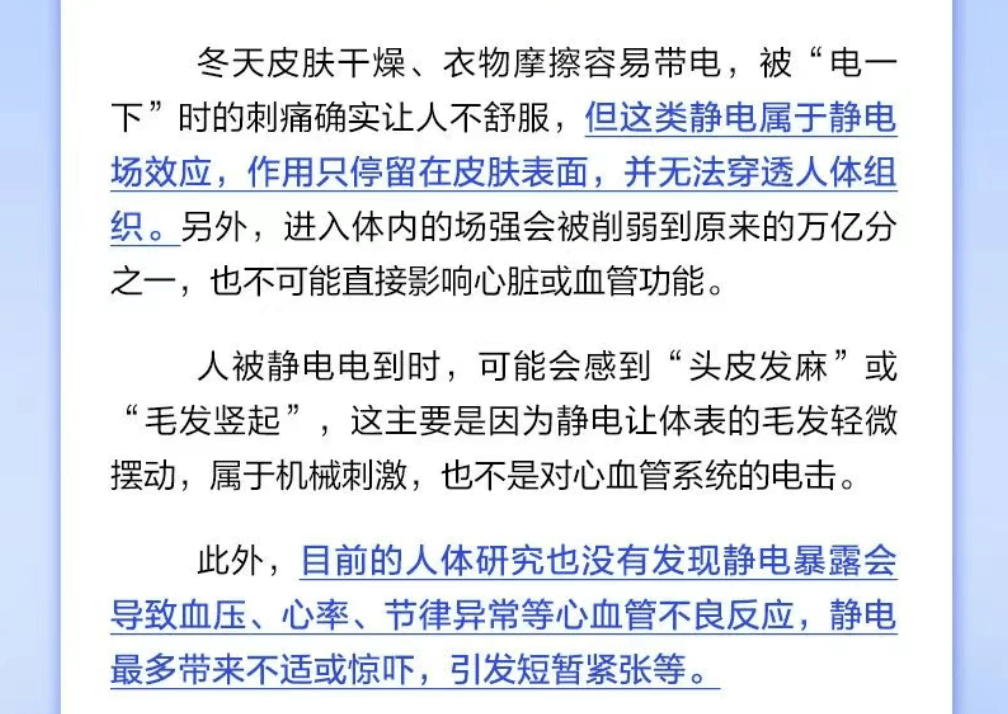 冬天皮肤干燥、衣物摩擦容易带电,被“电一下”时的刺痛确实让人不舒服,但这类静电属于静电场效应,作用只停留在皮肤表面,并无法穿透人体组织。目前的人体研究没有发现静电暴露会导致血压、心率、节律异常等心血管不良反应,静电最多带来不适或惊吓,引发短暂紧张等。