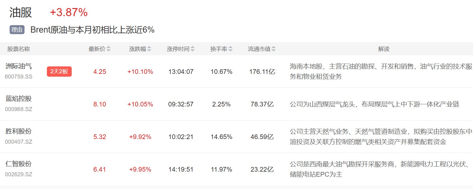油服板块今日大涨,洲际油气、蓝焰控股、仁智股份等多股涨停。