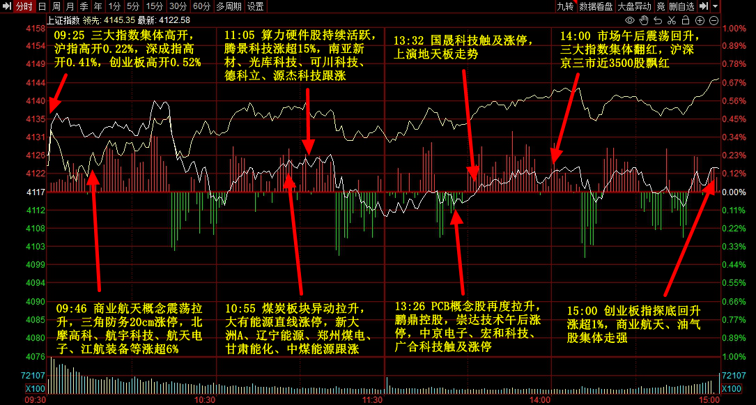市场全天探底回升,三大指数集体上涨。商业航天概念走强,三角防务、巨力索具等十余股涨停。油气股盘中拉升,仁智股份、胜利股份等封板。PCB板块延续强势,金安国纪、宏和科技等涨停。机器人概念反复活跃,福莱新材、毅昌科技涨停。下跌方面,半导体板块高开低走,蓝箭电子跌近10%。个股涨多跌少,沪深京三市超3500股飘红,今日成交2.72万亿。