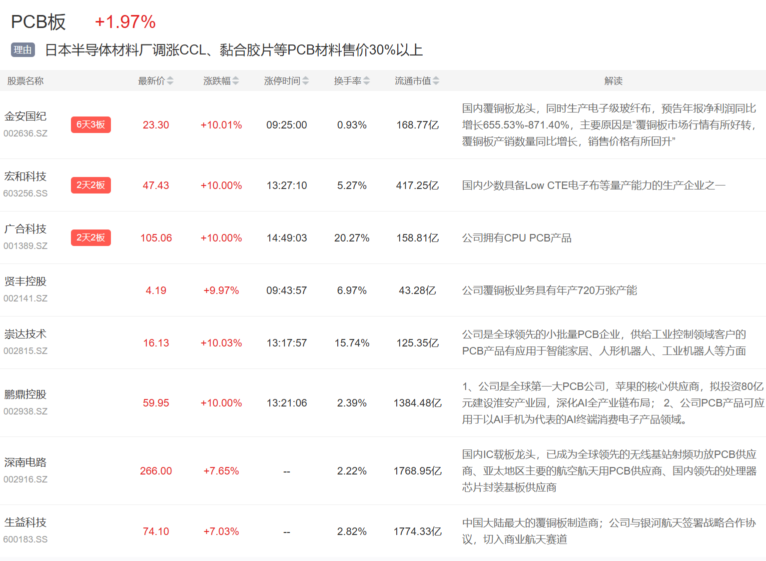 PCB板块今日大涨,金安国际一字涨停,宏和科技、广合科技等2连板,鹏鼎控股、崇达技术等涨停。