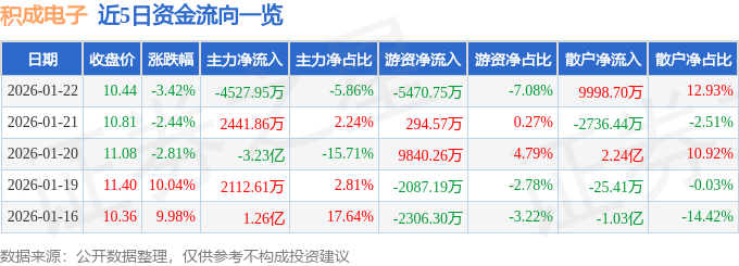 证券之星消息,截至2026年1月22日收盘,积成电子(002339)报收于10.44元,下跌3.42%,换手率15.4%,成交量73.71万手,成交额7.73亿元。
