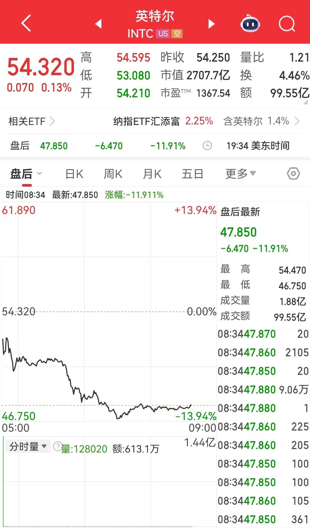 北京时间1月23日,计算机零件和半导体芯片制造商英特尔(INTC)美股盘后一度下跌超13%。