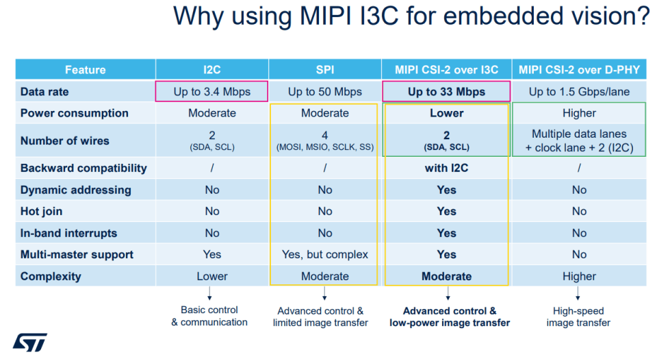 如图所示,在嵌入式视觉等领域,通过I3C可以实现更低功耗更低成本以及较高的速率传输水平。