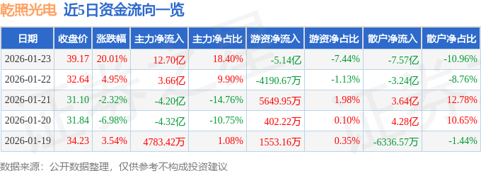 证券之星消息,截至2026年1月23日收盘,乾照光电(300102)报收于39.17元,上涨20.01%,涨停,换手率20.59%,成交量188.68万手,成交额69.06亿元。
