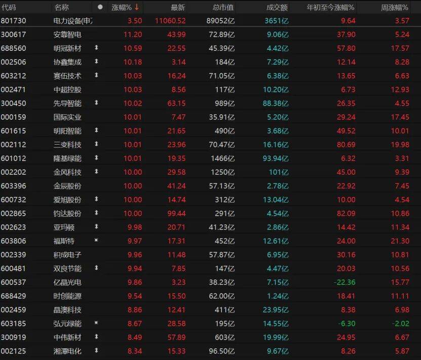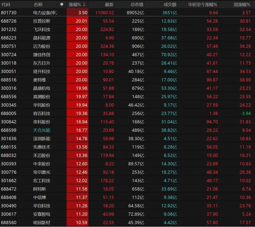 28只电力设备个股涨停,拉普拉斯、飞沃科技、晶科能源、迈为股份、捷佳伟创、东方日升、琏升科技、奥特维、晶盛机电、高测股份、华民股份“20cm”涨停,协鑫集成、赛伍科技、中超控股、先导智能、国际实业、明阳智能、三变科技、隆基绿能等个股涨停。