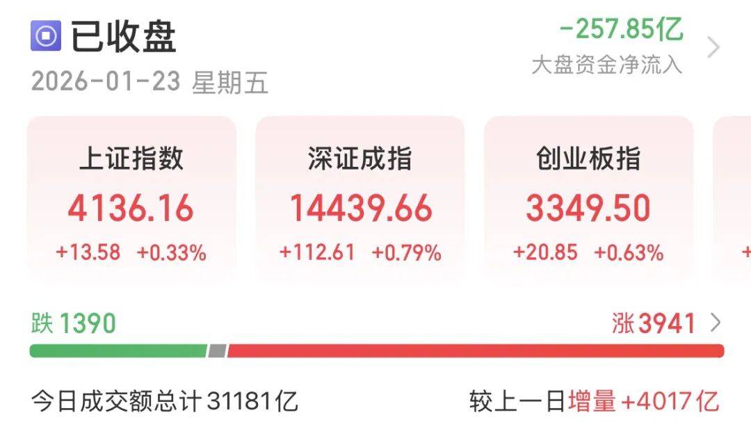 1月23日,市场喜气洋洋,指数、板块、个股上涨居多,量能放大逾4000亿元,日成交额跃升至3.12万亿元。杠杆资金持续回流,截至1月22日,沪深京两融余额已升至2.72万亿元。