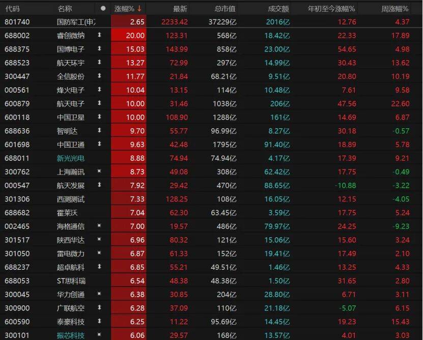 国防军工板块也表现不错,睿创微纳“20cm”涨停,国博电子、航天环宇、全信股份涨幅均超过10%,烽火电子、航天电子、中国卫星均涨停。