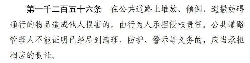 记者查询发现,对方回复中提到的作业时间为标准中的人工保洁作业时间。该标准中还提到机械捡拾的时间:一级、二级道路应在每日9点至16点和21点至次日6点进行作业。《中华人民共和国民法典》第一千二百五十六条明确:在公共道路上堆放、倾倒、遗撒妨碍通行的物品造成他人损害的,由行为人承担侵权责任。公共道路管理人不能证明已经尽到清理、防护、警示等义务的,应当承担相应的责任。那旧宫镇政府回复中的“事发时已过作业时段”能否规避所有责任呢?北京市律师协会交通运输法律专业委员会主任黄海波分析说: