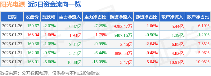 证券之星消息,截至2026年1月26日收盘,阳光电源(300274)报收于159.67元,下跌2.07%,换手率3.45%,成交量54.89万手,成交额87.88亿元。