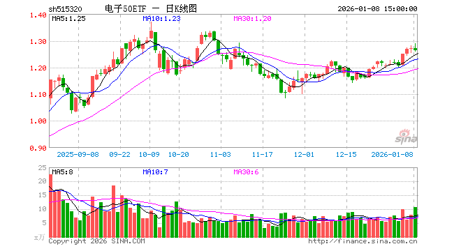1月8日,电子50ETF(515320)跌0.47%,成交额1356.35万元。当日份额减少500.00万份,最新份额为9630.90万份,近20个交易日份额减少800.00万份。最新资产净值计算值为1.22亿元。