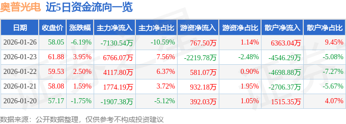 证券之星消息,截至2026年1月26日收盘,奥普光电(002338)报收于58.05元,下跌6.19%,换手率4.72%,成交量11.32万手,成交额6.74亿元。