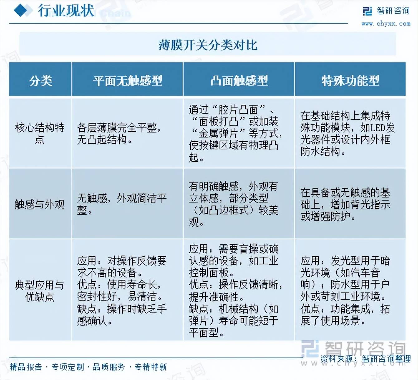 了解更多薄膜开关行业的深度研究分析和全面数据,请关注智研咨询发布的《中国薄膜开关行业市场全景调研及投资机会研判报告》。本《报告》从2026年全国薄膜开关行业发展环境、整体运行态势、运行现状、进出口、竞争格局等角度进行入手,系统、客观的对我国薄膜开关行业发展运行进行了深度剖析,展望2026年中国薄膜开关行业发展趋势。《报告》是系统分析2026年度中国薄膜开关行业发展状况的著作,对于全面了解中国薄膜开关行业的发展状况、开展与薄膜开关行业发展相关的学术研究和实践,具有重要的借鉴价值,可供从事薄膜开关行业相关的政府部门、科研机构、产业企业等相关人员阅读参考。