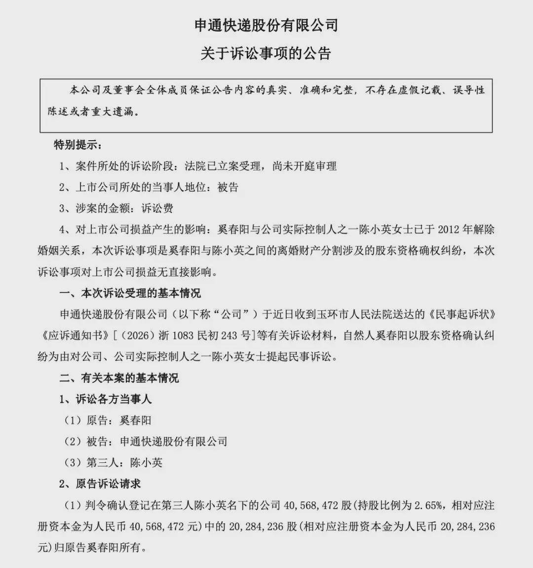 1月21日晚间,申通快递发布公告称,公司于近日收到玉环市人民法院送达的有关诉讼材料,自然人奚春阳以股东资格确认纠纷为由,对公司以及公司实际控制人之一陈小英提起民事诉讼。奚春阳认为,陈小英名下的申通快递大约4056.85万股,系双方离婚时约定分割的特定夫妻共同财产并经重组上市而转化形成的财产之一。根据双方离婚时对财产分割的约定,申通快递与陈小英均应就前述2028.42万股归属予原告。