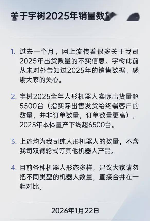 宇树科技发布关于宇树2025年销量数据的澄清表示,过去一个月,网上流传着很多关于我司2025年出货数量的不实信息。宇树此前从未对外告知过2025年的销售数据。宇树2025全年人形机器人实际出货量超5500台(指实际出售发货给终端客户的数量,并非订单数量,订单数量更高),2025年本体量产下线超6500台。上述均为我司纯人形机器人的数量,不含我司双臂轮式等其他机器人产品。(宇树科技)
