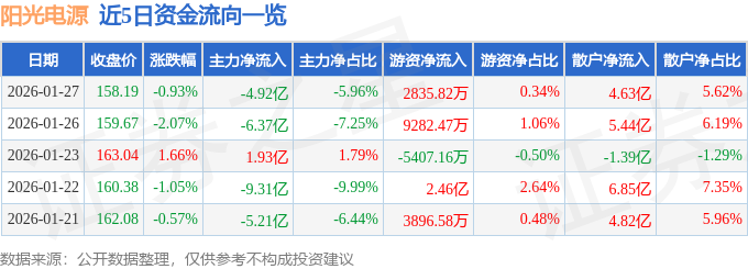 证券之星消息,截至2026年1月27日收盘,阳光电源(300274)报收于158.19元,下跌0.93%,换手率3.28%,成交量52.12万手,成交额82.45亿元。