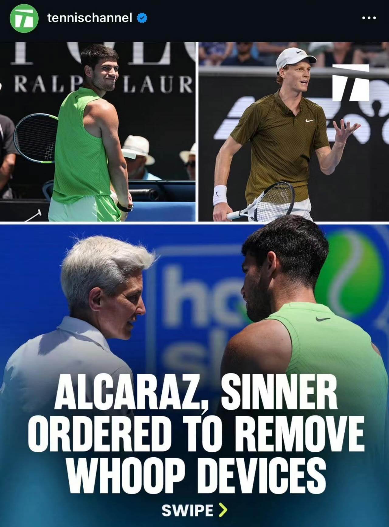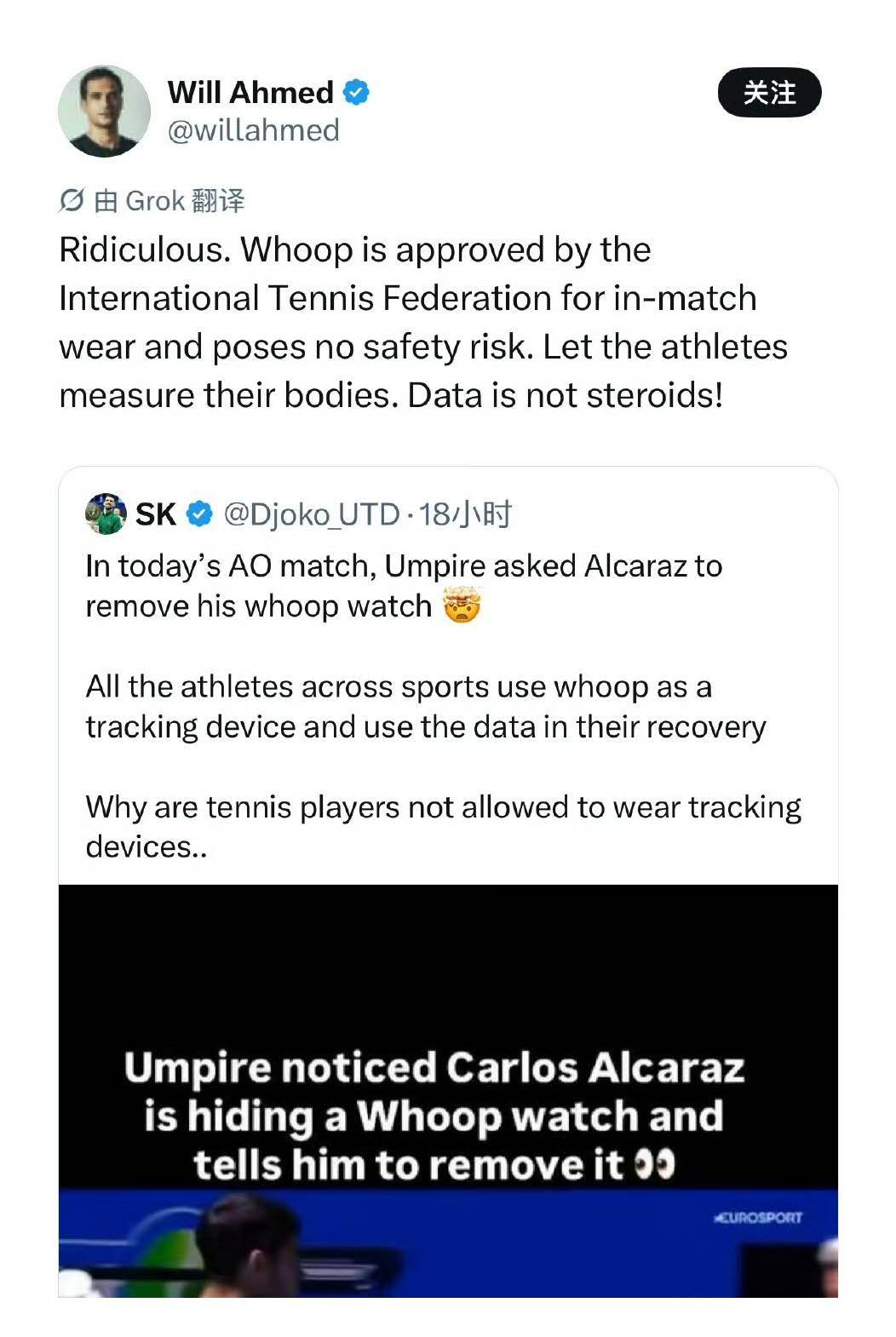 Whoop首席执行官在今天发文回应澳网禁止阿尔卡拉斯穿戴此设备一事时说道:“荒谬!Whoop已被国际网球联合会批准用于比赛中穿着,且不构成安全风险。让运动员测量他们的身体吧。数据不是类固醇!(之前辛纳兴奋剂事件)”
