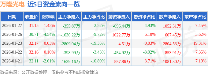 证券之星消息,截至2026年1月27日收盘,万隆光电(300710)报收于31.15元,上涨1.43%,换手率6.18%,成交量4.61万手,成交额1.41亿元。