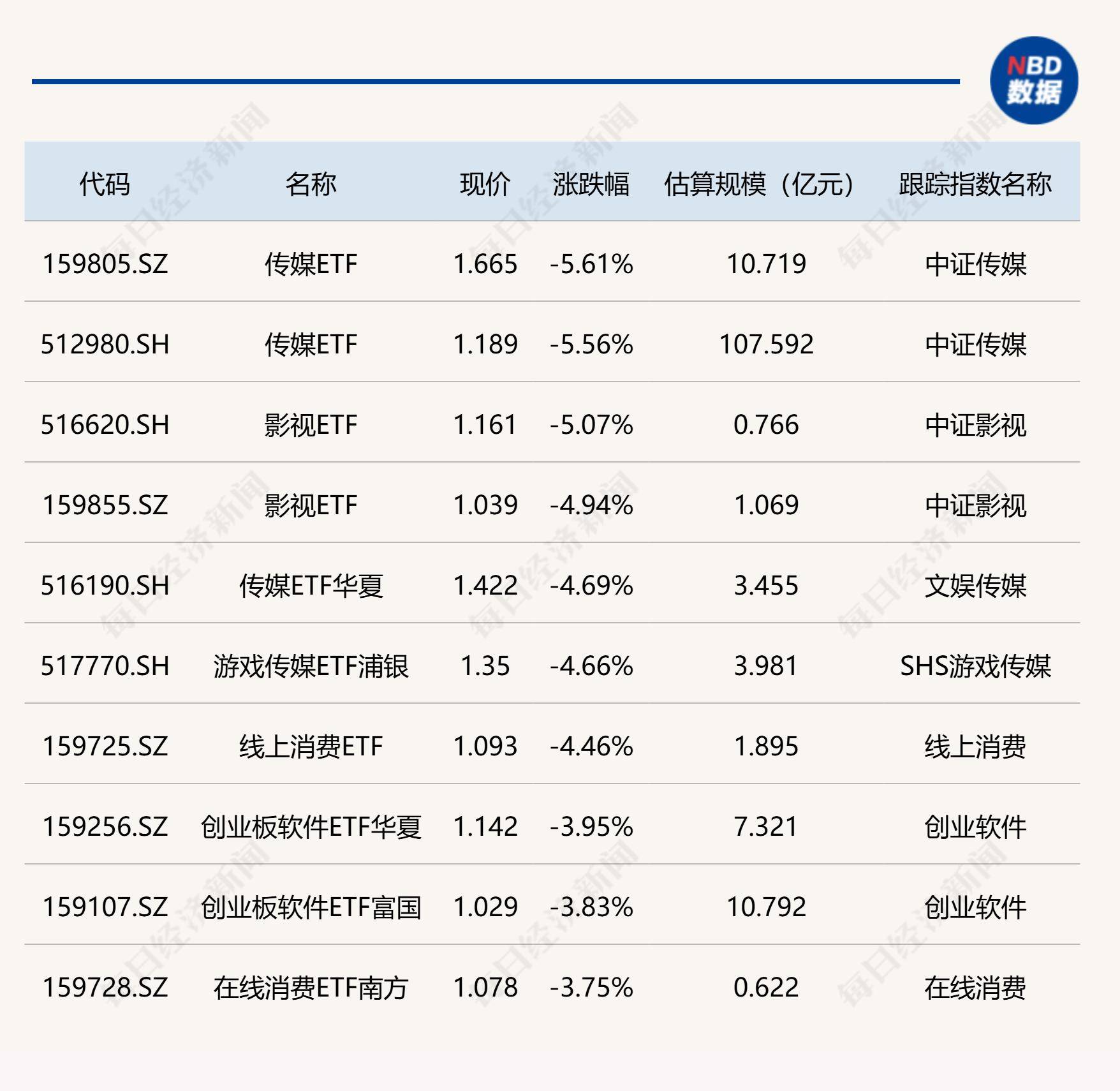 下跌方面,传媒ETF、影视ETF跌超5%。