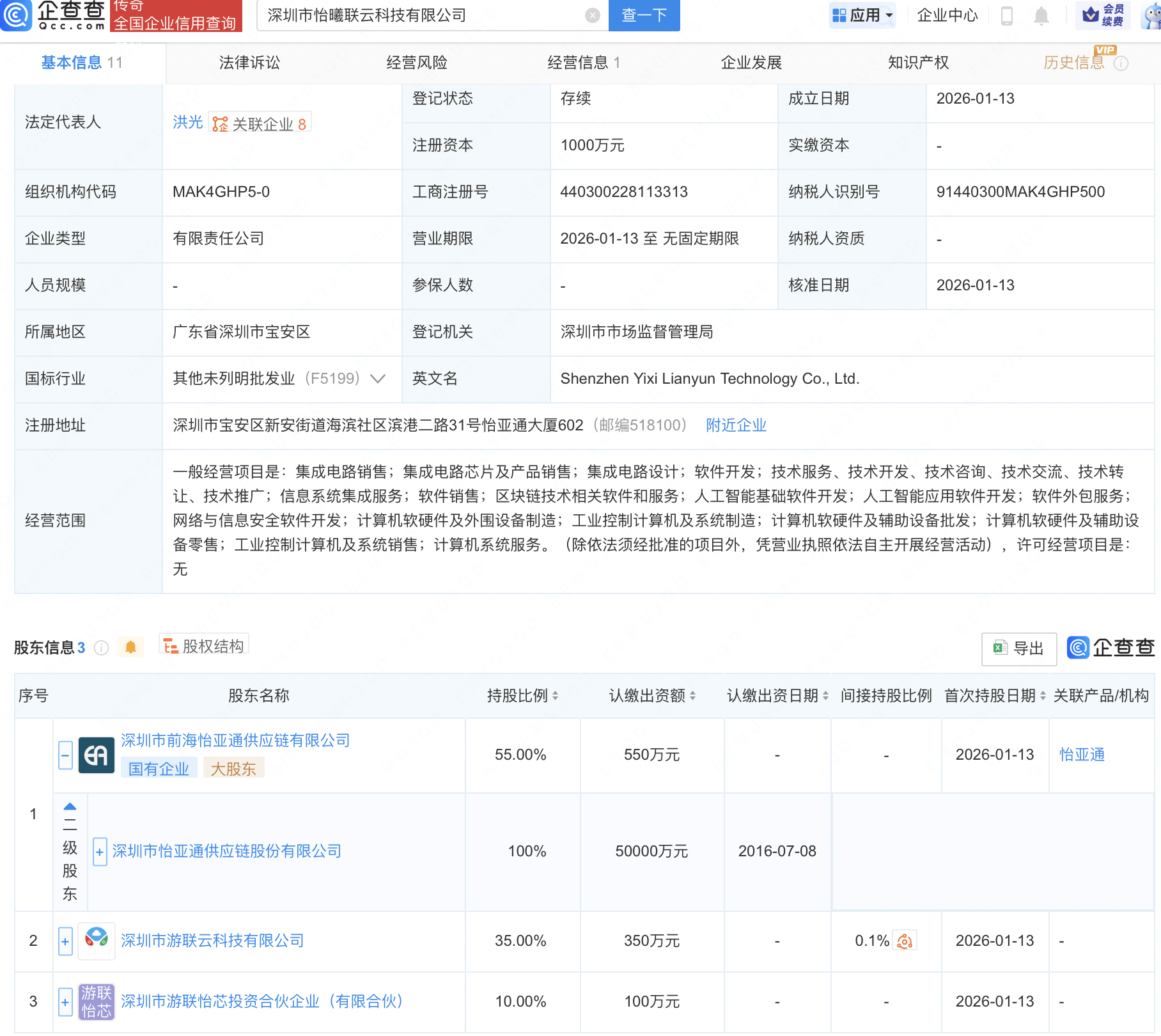 企查查APP显示,近日,深圳市怡曦联云科技有限公司成立,注册资本1000万元,经营范围包含:集成电路芯片及产品销售;集成电路设计;人工智能基础软件开发;人工智能应用软件开发等。企查查股权穿透显示,该公司由怡亚通(002183)全资子公司深圳市前海怡亚通供应链有限公司等共同持股。