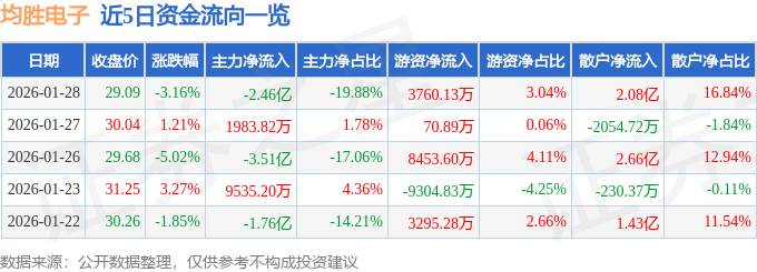 证券之星消息,截至2026年1月28日收盘,均胜电子(600699)报收于29.09元,下跌3.16%,换手率3.12%,成交量42.25万手,成交额12.35亿元。