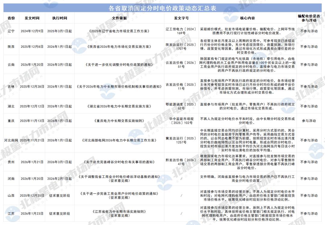 河南:2026年1月20日发布《关于调整我省工商业分时电价峰谷浮动基数的通知》(征求意见稿),文件明确,河南省直接参与电力市场交易的用户已不再执行工商业分时电价政策。并且自2026年2月1日起输配电价不参与浮动。
