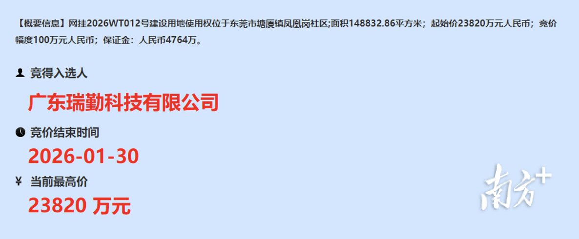 1月30日,2026年塘厦镇第一宗公开挂牌出让的国有土地成功拍出,广东瑞勤科技有限公司(下称“瑞勤科技”)以23820万元摘得2026WT012地块。