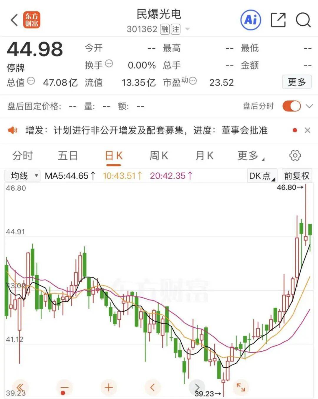 截至1月16日收盘,民爆光电股价报44.98元/股,总市值为47.08亿元。