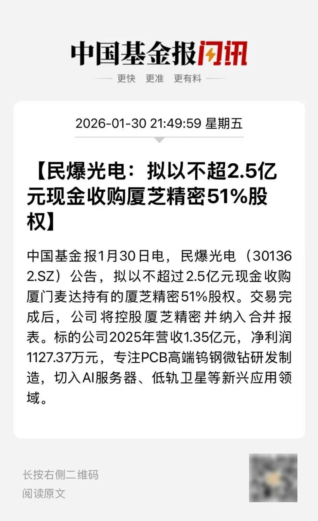 1月30日,民爆光电公告称,拟以现金方式收购厦门麦达智能科技有限公司持有的厦门厦芝精密科技有限公司(以下简称厦芝精密)51%的股权。本次交易完成后,民爆光电将成为厦芝精密的控股股东,标的公司将成为民爆光电的控股子公司。
