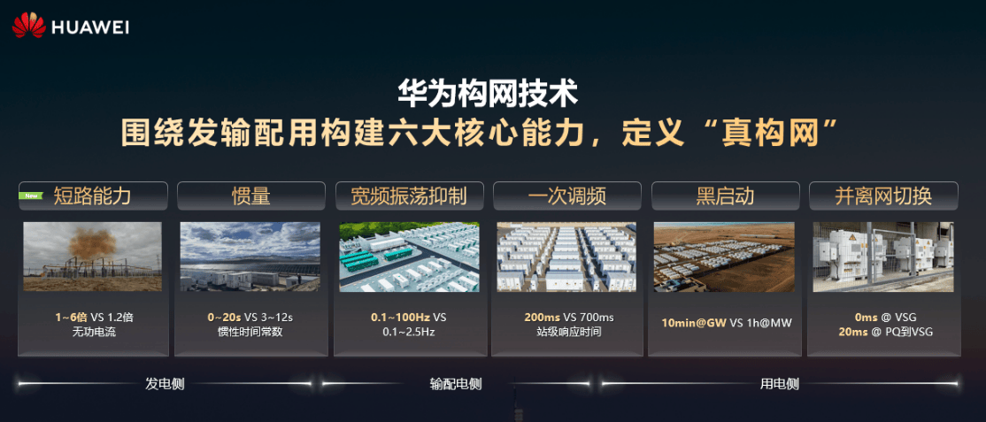 随着新能源渗透率的持续提升,电力系统呈现高比例新能源、高比例电力电子设备的“双高”特征,对电力系统的安全、稳定运行提出了新的挑战,构网技术是解决电网稳定和平衡的关键技术,将支撑新型电力系统安全、稳定运行。蔡凌宇表示,华为构网技术围绕“发输配用”全场景构建六大核心能力,即短路支撑、虚拟惯量支撑、宽频振荡抑制、快速一次调频、分钟级黑启动、以及无缝并离网切换,定义“真构网”。经实践检验,大幅提升了新能源的并网消纳水平和新型电力系统的稳定性。