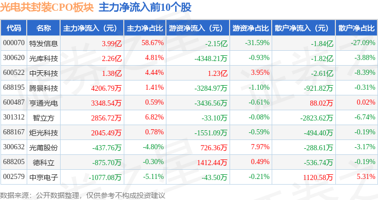 从资金流向上来看,当日光电共封装CPO板块主力资金净流出91.18亿元,游资资金净流入60.89亿元,散户资金净流入30.29亿元。光电共封装CPO板块个股资金流向见下表: