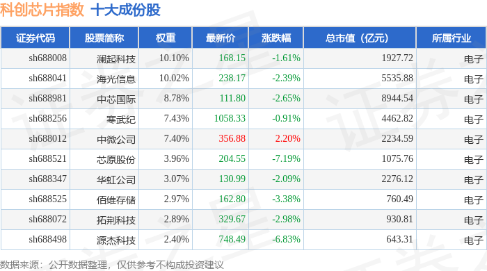科创芯片(000685)指数十大成份股详情如下: