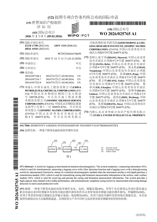 证券之星消息,根据企查查数据显示石化油服(600871)公布了一项国际专利申请,专利名为“一种基于瞬变电磁的电阻率测井系统”,专利申请号为PCT/CN2024/138459,国际公布日为2026年2月5日。