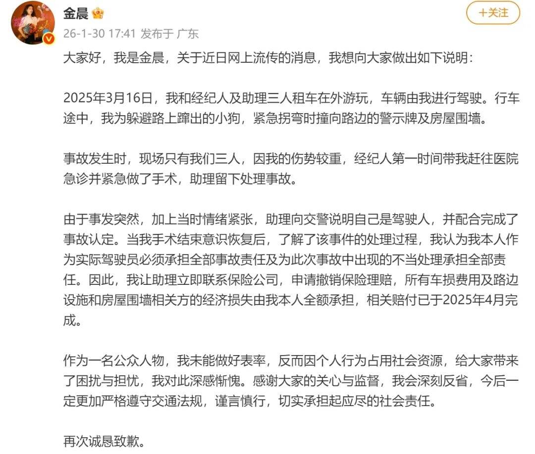 据警方通报,2025年3月16日,金晨因避让路上窜行犬只发生单车事故。事发后,金晨因受伤前往医院就诊,由助理徐某青留在现场处置。调查中,徐某青谎称自己系驾驶员,配合交警完成事故处理。