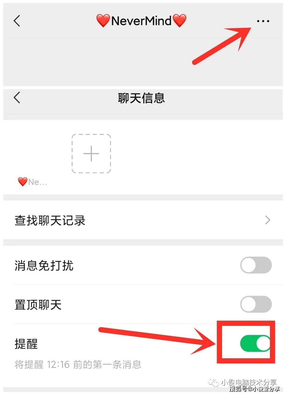 操作方法很简单,打开和好友的聊天界面,点击右上角的三个小点,进入聊天设置页面,找到**【提醒】** 开关并打开,开启后就会自动触发**【强提醒】** 功能。