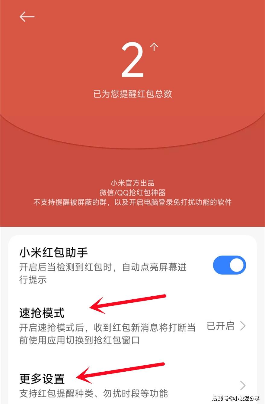 我们点击更多设置,然后把要提醒的红包类型开关打开,像微信红包、QQ红包,这些开关打开,以及还可以把下面的仅提醒群红包开关打开,这样就能避免群消息过多,对我们造成打扰!
