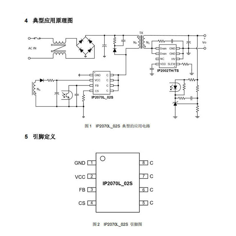 IP2070L_02S集成了一颗耐压750V的功率MOSFET,可直接驱动反激式拓扑结构,无需外置功率管。这一设计有助于减少外围元件数量,降低PCB面积与制造成本,同时也有利于提升系统的可靠性。