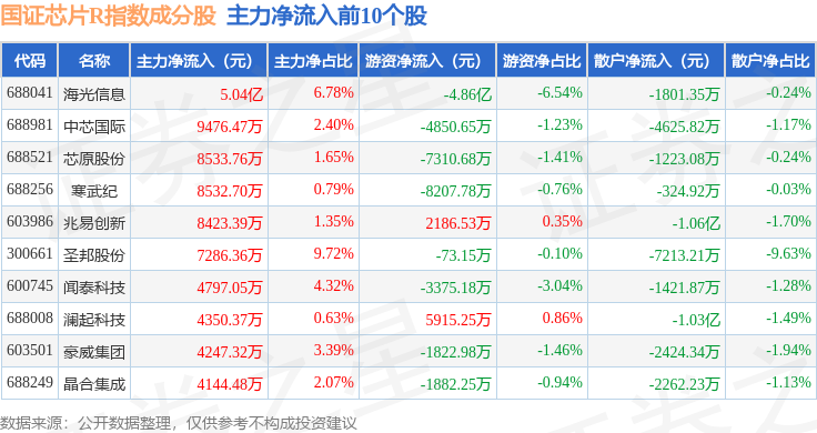 资金流向方面,国证芯片R(480017)指数成份股当日主力资金净流出合计5.78亿元,游资资金净流出合计2289.8万元,散户资金净流入合计6.01亿元。成份股资金流向详情见下表: