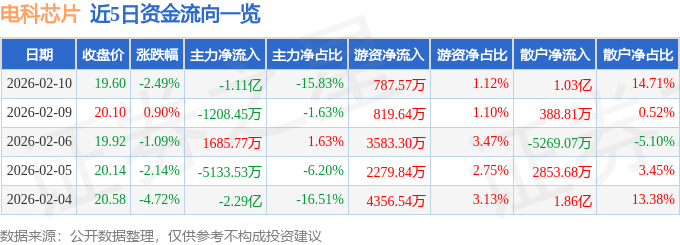 证券之星消息,截至2026年2月10日收盘,电科芯片(600877)报收于19.6元,下跌2.49%,换手率3.0%,成交量35.58万手,成交额7.01亿元。