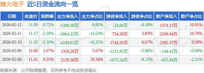 证券之星消息,截至2026年2月12日收盘,烽火电子(000561)报收于11.09元,下跌0.72%,换手率1.72%,成交量12.33万手,成交额1.37亿元。