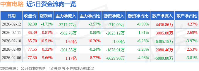 证券之星消息,截至2026年2月12日收盘,中富电路(300814)报收于82.3元,下跌4.73%,换手率6.59%,成交量12.62万手,成交额10.4亿元。