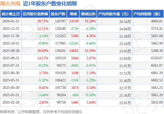 证券之星消息,近日南大光电披露,截至2026年1月31日公司股东户数为14.38万户,较12月31日增加2.32万户,增幅为19.28%。户均持股数量由上期的5733.0股减少至4807.0股,户均持股市值为26.54万元。