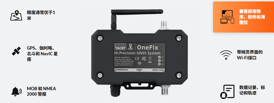 OneFix是Digital Yacht最新推出的高性能GNSS(全球导航卫星系统) 传感器。它采用多卫星网络和新型双频技术,旨在提供超高精度的定位(通常优于1米),更重要的是,它内置了强大的防欺骗算法,可实现更可靠的导航。OneFix几乎可以适配任何导航系统(包括传统设备),并可连接iPad、平板电脑以及最新的NMEA 2000兼容多功能显示器。OneFix致力于为所有船艇用户带来高精度、高可靠性的导航体验。