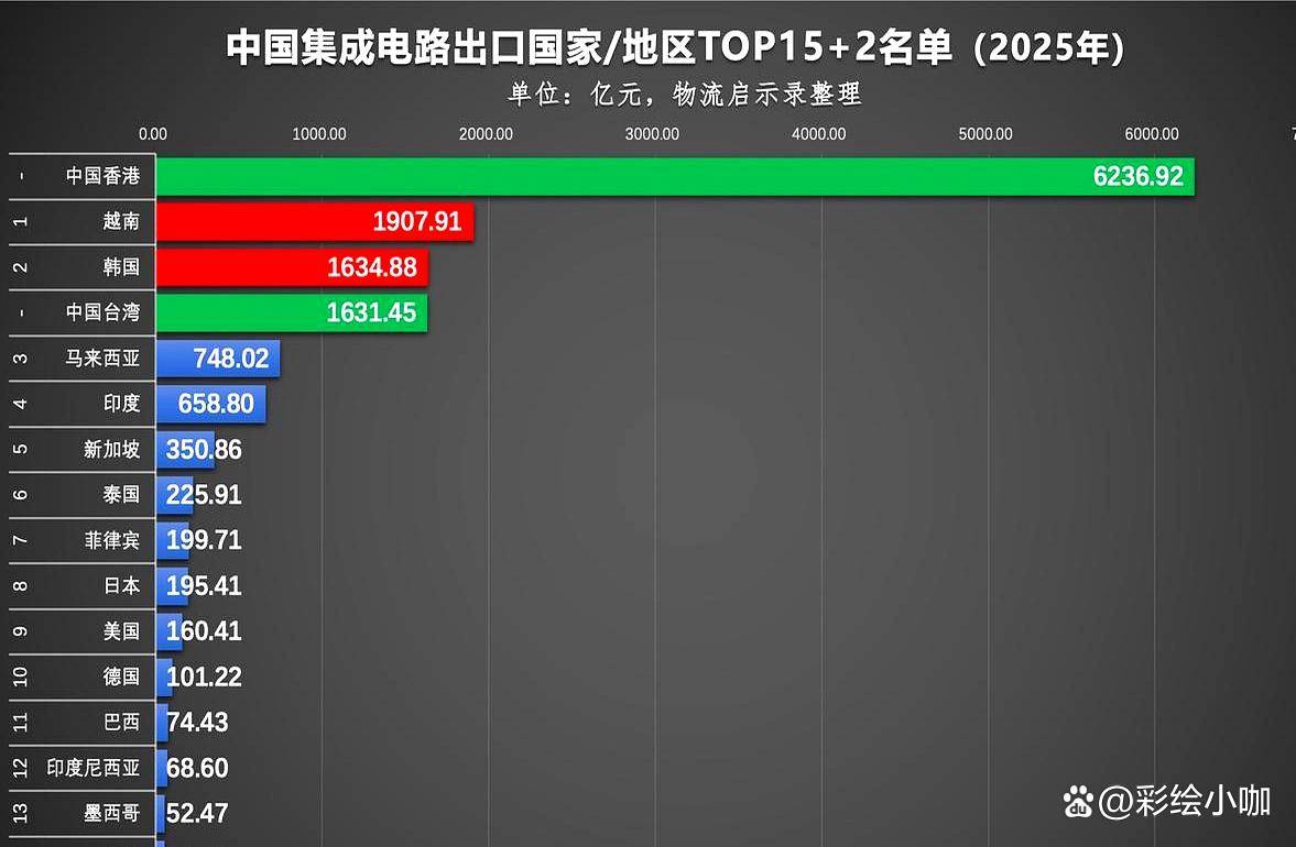 好了,讲完我们花钱买了什么,再来看看我们卖出去的1.4万亿,又流向了哪里。这部分的故事,可能比进口更有意思,因为它真切地反映了我们在这个产业链里的角色变化。最大的买家是谁?你可能想不到,是中国香港。超过四成的芯片都卖到了那里。